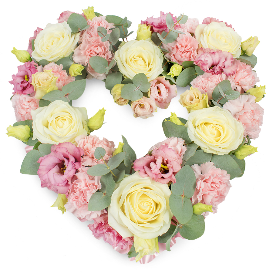 Show your compassion with our Graceful Open Heart Arrangement. This exquisite bouquet features a delicate mix of white roses, pink carnations, pink lisianthus, and eucalyptus leaves, beautifully arranged to reflect elegance and heartfelt remembrance.
