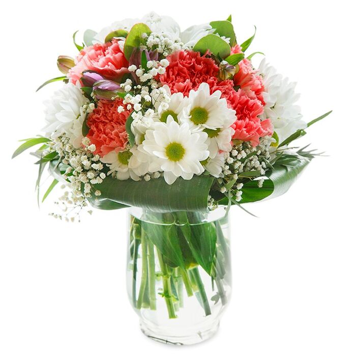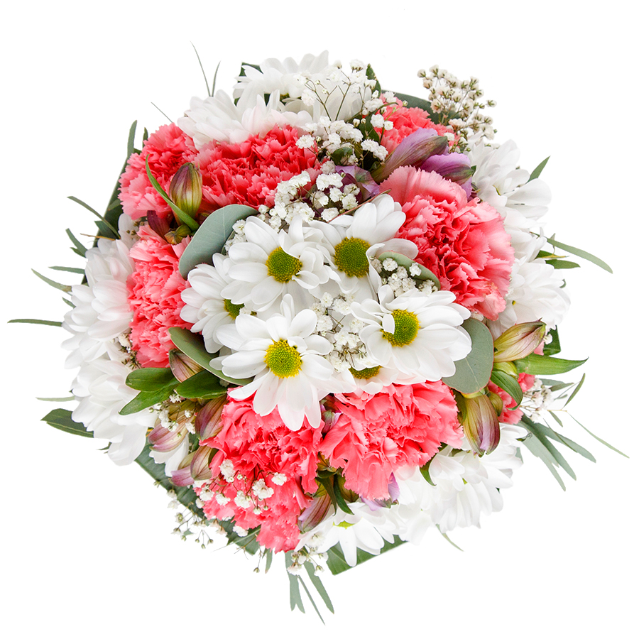 Enhance any occasion with our beautiful and distinctive flower arrangement. This elegant bouquet combines snow-white chrysanthemums, airy gypsophila, soft light pink carnations, and rich aspidistra leaves, arranged to perfection for a stunning visual impact.